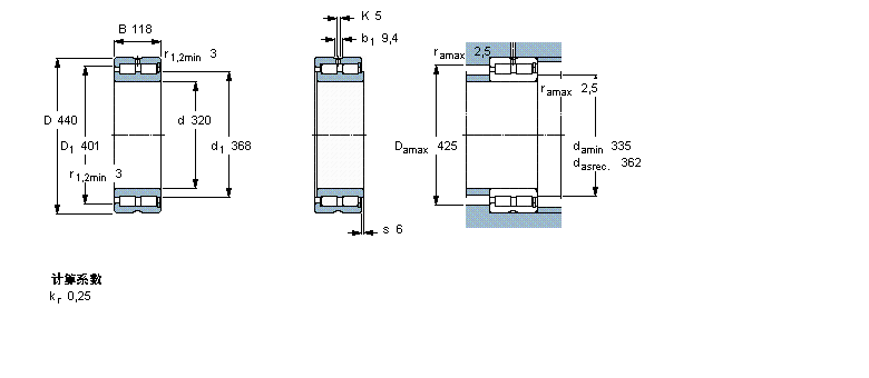 | 圆柱滚子轴承, 双列满装滚子, 无密封件, 单方向轴向负荷的挡边 | ||||||||||